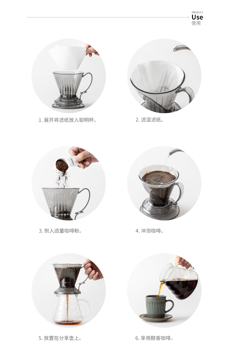 下图是我从某宝上盗来的使用方法图,需要注意的是咖啡粉通常用15g,粉水比1:14-16,水温88-92°C,烘焙度越浅水温越高。浸泡时间约在三分半钟,也可以视出品口感微调。