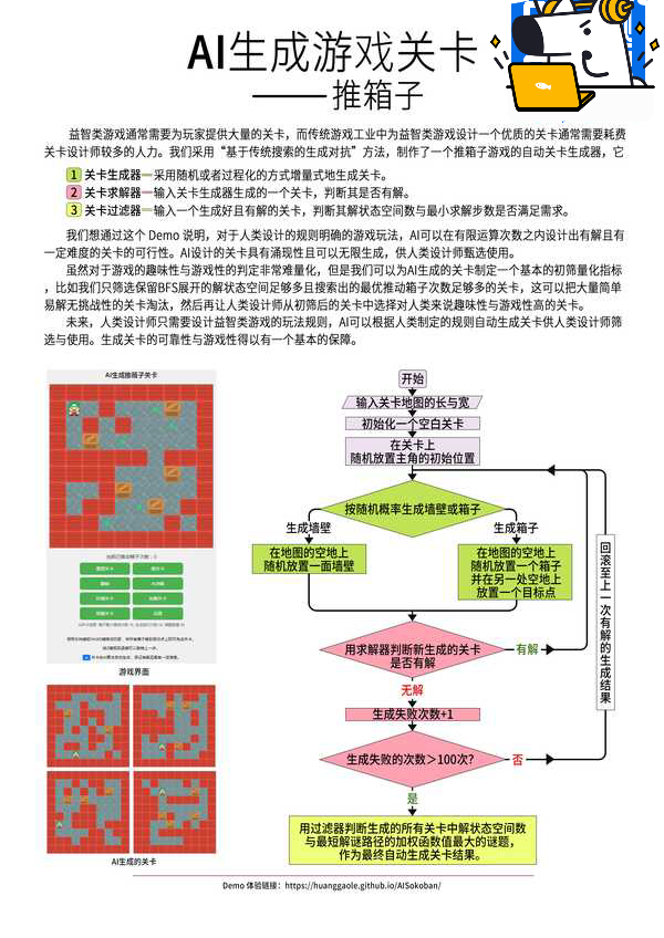 对于某款特定规则的益智类游戏(如推箱子),基于传统搜索与对抗生成的思路,无限生成有解且有一定难度门槛的具体游戏关卡: